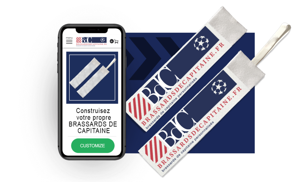 Suivez les étapes proposées par notre site et vous arriverez en quelques secondes au configurateur : vous pourrez y donner libre cours à votre imagination, en téléchargeant des images, des photographies, des textes et des logos; vous pourrez donner vie à votre brassard de rêve en toute autonomie.